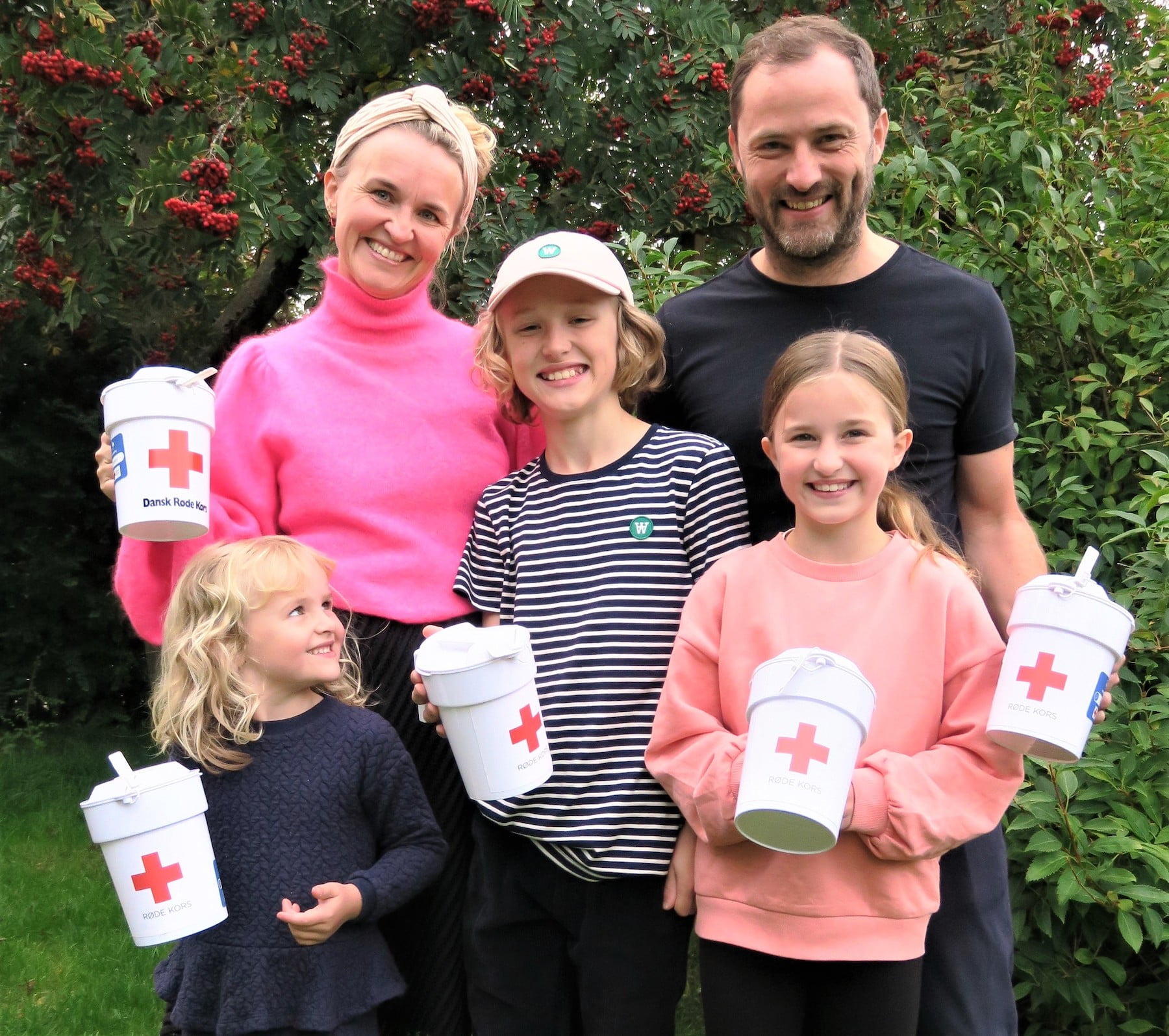Familien Charlotte Hagelquist og Martin Mørkebjerg, samler ind til nødhjælp for Røde Kors sammen med deres 3 børn, fra venstre Mynte (5 år), William (11 år) og Alberte (8 år). Foto: Jerry Ritz/Røde Kors