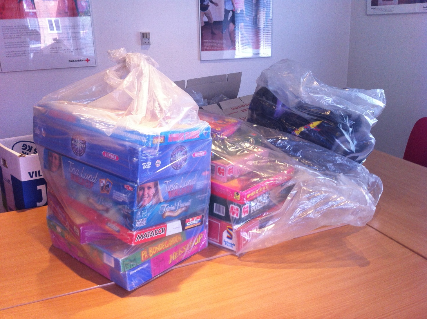 Så er vi i gang med at pakke legetøj m.v. til Røde Kors’ familielejr i Strib. Butikkens søde personale har samlet masser af spil, puslespil, rulleskøjter, tennisketsjere, cirkusudstyr, crocketspil, cykelhjelme og en hel masse andre børneting sammen. Der er vist ingen tvivl om at lejrens 55 børn vil tage meget godt imod alle de ”nye” legesager.